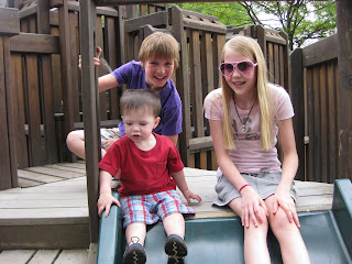 So all of our RV trips so far this year have been what we call 'driveway camping'. We finally planned a real trip and spent the weekend at Sugar Shores RV Resort in Durand, IL (about 2 hours from home). I picked this place because it had all of the amenities we like (pool, playground, shaded sites) and it had some really positive reviews. I was a little worried since it seemed very geared toward owned lots instead of rentals. To our surprise it ended up being a very friendly campground – both owners and renters. We spent much of our time with a family three spaces down from ours. Oddly enough the wife's name was Heather also. But the funnier part was their two oldest kids were Morgan and Nathan. They were really great people and we shared experiences in RVing and child raising. Morgan and Nathan couldn't seem to get enough of Ben and Neil and had loads of fun at the pool and showing of the frogs they caught at the Resorts frog pond. All in all we had fun at this resort, but it did have as many activities as some other resorts where we've stayed.